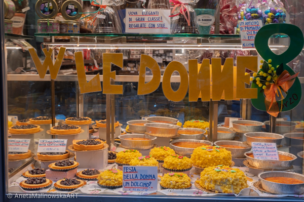 Tort Mimosa: Cukiernie serwują specjalne ciasto zwane Torta Mimosa. Jest to biszkopt z kremem, posypany drobnymi kawałkami żółtego biszkoptu, co ma przypominać kwiaty mimozy.